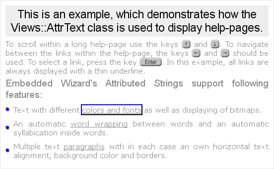 Besides the regular text rendering Embedded Wizard also provides an Attributed Text view specialized to display text enriched by attributes to control the text output. Similarly to HTML these attributes determine the alignment, the colors and fonts to print the text. The text can be arranged in paragraphs and columns. Also, it can be combined with images and hyperlinks can be defined. This feature is suitable to display user manuals and help pages within your application: