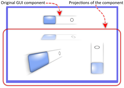 You can perform the texture mapping operations also on GUI components. For this purpose you use the Warp Group view. In this manner multiple images of the original component can appear simultaneously at various screen locations, every with a different 2D or 3D transformation. The copies can also react to user touch or mouse inputs similar to how the original component does.