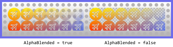 Per default all Embedded Wizard drawing operations are performed with alpha blending. In such case new semitransparent contents are mixed with the contents existing already in the background. If an operation is performed without alpha blending, the existing contents in the background are simply overwritten: