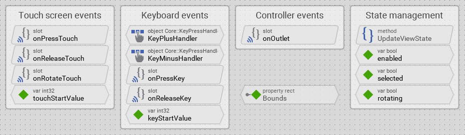 GUI applications created with Embedded Wizard can be controlled by a touch screen or a mouse device. Embedded Wizard supports multi-touch interactions involving up to 10 fingers. In this manner the user can simultaneously control separate widgets within the application (e.g. move two sliders at the same time) or perform multi-touch gestures like pinch, zoom, etc.. Following ready to use Touch Handlers are available::