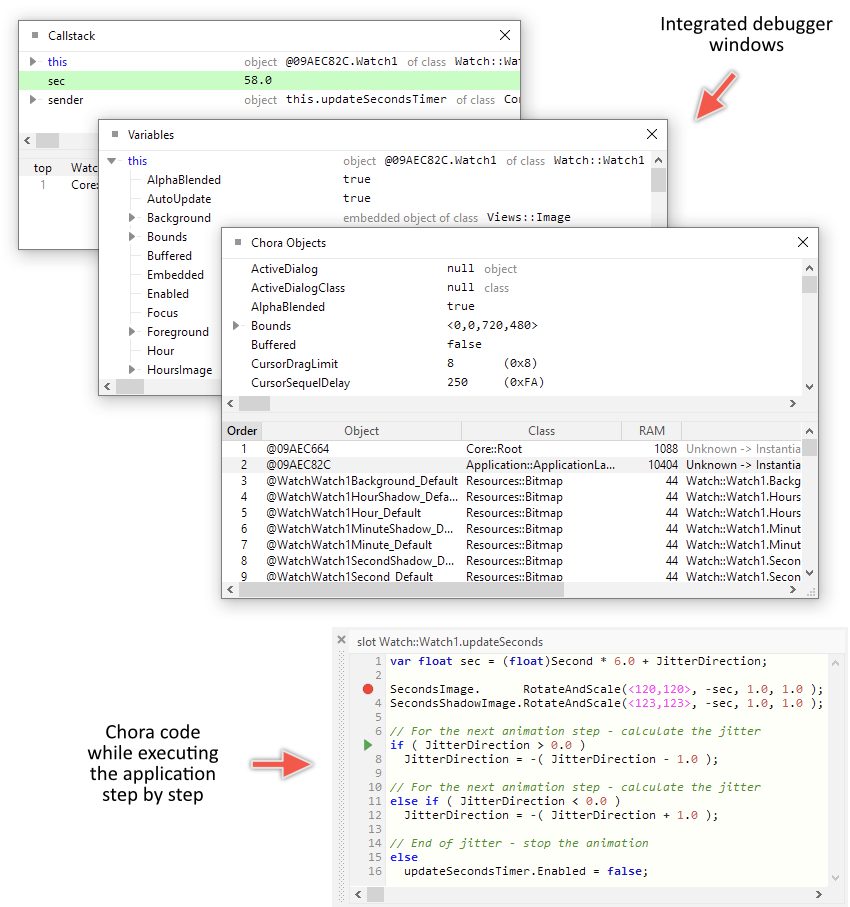 With Embedded Wizard Studio you can implement complete functionality of the GUI application without depending on any other external development tools. If your implementation does not work as expected you can set breakpoints within Chora code, execute the code step by step, inspect variables, objects and the call stack. Embedded Wizard integrates all tools needed to debug your application already at the design time.