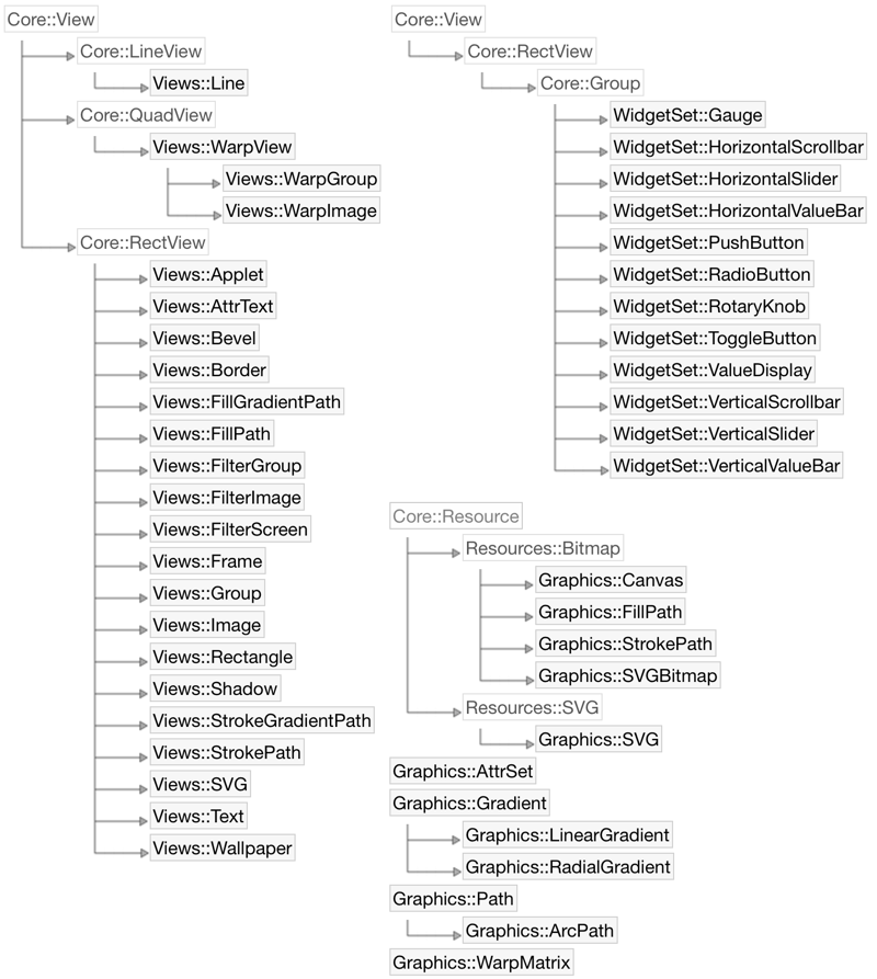 From technical point of view, Mosaic is a class library, completely object-oriented designed and implemented in the platform independent programming language Chora. A GUI application inherits this functionality and if necessary extends or overrides it. Consequently the Mosaic and the application conflate together. For example, all GUI components used within the application are direct or indirect descendants of the Mosaic class Core::View. This base class implements an infrastructure for the derived components, capacitating them to perform screen updates and to process user inputs. Additional classes to manage graphical objects and perform effects are available.