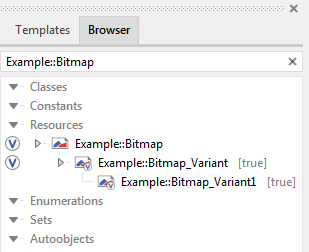 A bitmap resource member, which has been overridden by a variant member is considered as being multi-variant. You can derive as many variants of an original member as you want. Moreover, one bitmap resource variant can override another bitmap resource variant resulting in a hierarchy of variants. With the Browser window you can inspect this hierarchy. Please note, a member overridden by a variant is signed in the Browser with an additional small