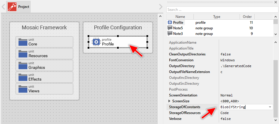 In case, the storage location should be configured generally for all constants and/or resources, the profile member provides two attributes StorageOfConstants and StorageOfResources. For example, configuring StorageOfConstants with the value BlobIfStrings will have the effect of all constants containing a string to be located inside the Blob file instead of inside the generated code: