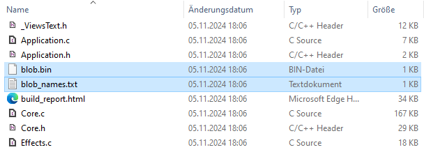 The data, thus, is not part of the binary. The code generated for the application limits to refer the data members existing in the Blob file only. At the runtime when accessing a constant or resource from the Blob file, the directory inside the Blob file is searched for the referenced member and the found member is used. By exchanging the Blob file, the contents of constants and resources can be modified easily. The application itself (the binary) can remain untouched in such case.