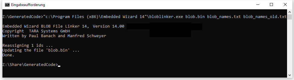 This re-link process is done by the bloblinker.exe tool found in the installation directory of Embedded Wizard Studio. Start this tool from the Windows command line and provide it with three parameters: (1) the blob.bin file to update its numbers, (2) the blob_names.txt file corresponding to the blob.bin file, (3) the blob_names.txt file from the code generated to build the binary. For example:
