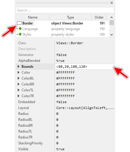 As long as the Border view is selected you can inspect and modify its properties conveniently in the Inspector window as demonstrated with the property Bounds in the screenshot below: