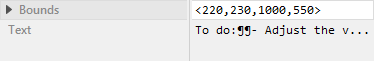 The attribute Bounds must be a Chora rect literal, consisting of exact four integer numbers x1-value, y1-value, x2-value and y2-value, separated by , (comma) signs and enclosed between a pair of < ... > (angle brackets).