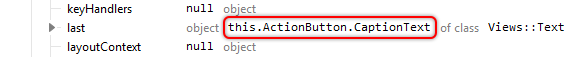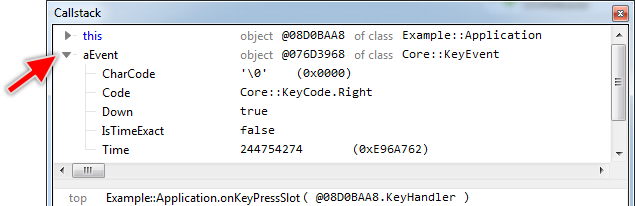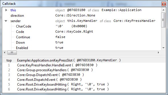 The upper part of the window displays all operands existing in the context of the method, which is currently selected in the window's lower callstack area. In particular it includes the latest values of all local variables and arguments as well as the object this in context of which the selected method has been called. In this area you can inspect the values of the respective operands: