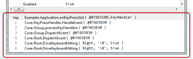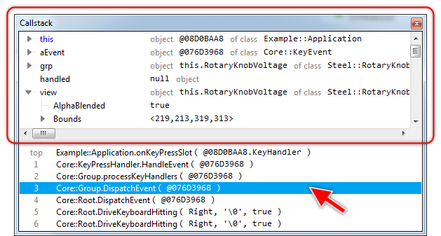 The lower part of the window presents a list with all currently nested methods. The entry on the top corresponds to the last called method - it is in fact the top of the stack. The methods are displayed with the arguments passed in at the time the respective method was originally invoked. In this area you can evaluate and inspect the call history: