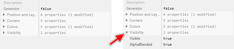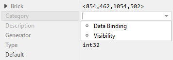 The attribute Category specifies a category for the corresponding property. Based on this information, Inspector window can better sort and group all related properties. In the simplest case, the attribute contains the name of the category, e.g. Visibility. Accordingly, the affected property will be grouped together with all other properties configured with the same category name. The user can thereupon expand and collapse the category by simply clicking on the expand button found on the left of the category name: