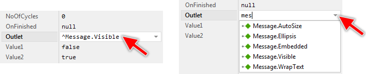 The connection is established by initializing the Effect's property Outlet with a reference to the property you in fact intend to animate. The reference is built by prefixing the name of the desired property with a reference operator ^. For example, if you want the Animation Effect to control the Visible property of a Text view named Message, you have to initialize Outlet with the expression ^Message.Visible as shown in the screenshot below. Please note, that using the Inspector Assistant you can conveniently select the right property:
