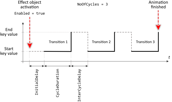 Per default, as long as an Effect object is enabled, its transition is repeated endlessly. In other words, after the transition has reached the end value, the animation starts again with the start value. This can be controlled more exactly by modifying the property NoOfCycles. Initializing this property with the value 4 will cause the animation to repeat the transition four times. Afterwards the animation stops and deactivates itself. Accordingly, if you want to limit the animation to a single run, you have to initialize NoOfCycles with the value 1. Initializing NoOfCycles with 0 (zero) restores the default behavior of the transition being repeated endlessly.