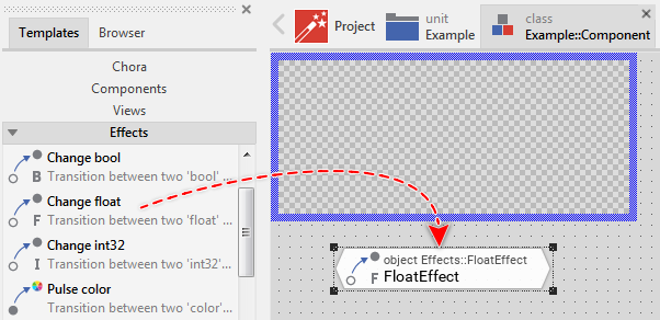 The Mosaic class Effects::FloatEffect implements an animation object specialized to calculate a transition between two float key values. This so-called Change float Effect can be used to enrich your GUI component with animations, in particular to control the properties of views embedded within the GUI component. At the runtime, the Effect object modifies the property with values resulting from the interpolation between the specified key values.