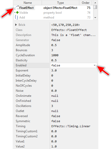 Please note, that this Effect object is optimized to handle with float values only. Other data types are supported by the Effects Change int32, Pulse color, Move point, Move and resize rect and Change bool.