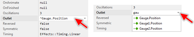 The connection is established by initializing the Effect's property Outlet with a reference to the property you in fact intend to animate. The reference is built by prefixing the name of the desired property with a reference operator ^. Assuming, if you want the Animation Effect to control a float property named Position of an embedded GUI component named Gauge, you have to initialize Outlet with the expression ^Gauge.Position as shown in the screenshot below. Please note, that using the Inspector Assistant you can conveniently select the right property: