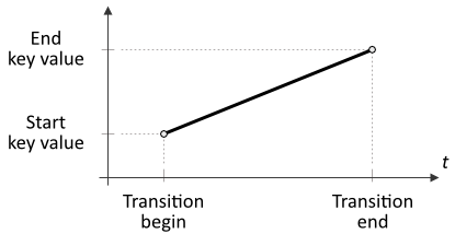 The Effect object describes the animation as a continuous transition between two predetermined key values. At the runtime, when the animation is active, the both values are used to interpolate between them the actual progress of the animation as function of the elapsed time. For example, a simple scaling effect to fade-in a Warp Image view could be configured as transition between the key value 0.0 and 1.0. The following figure demonstrate the idea of key values and the interpolated curve lying in between: