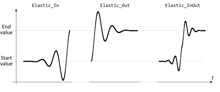 The functions Elastic_In, Elastic_Out and Elastic_InOut are based on the common equation f(t)=t^3*sin(t*90*(1+4*Oscillations)) with the value of the equation operand Oscillations represented by the homonymous property Oscillations. The larger the value, the more oscillations are included. With the default initialization of this property (value 3) the timing functions are as follows: