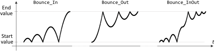 The functions Bounce_In, Bounce_Out and Bounce_InOut implement a sophisticated bounce timing function. The total number of bounces is determined by the property Bounces. How much the amplitude is increased or decreased with every bounce is determined by the property Elasticity. With the default initialization of the property Bounces (value 3) and Elasticity (value 0.5) the timing functions are as follows: