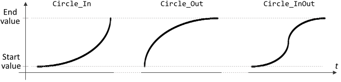 The following three functions Circle_In, Circle_Out and Circle_InOut are based on the common equation f(t)=1-sqrt(1-t^2). The timing functions are as follows: