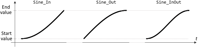 Finally, the following three functions Sine_In, Sine_Out and Sine_InOut are based on the common equation f(t)=sin(t*90). The timing functions are as follows: