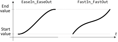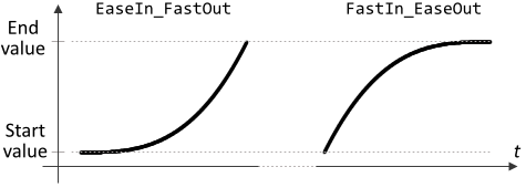 Other two popular functions EaseIn_EaseOut and FastIn_FastOut are ideal when you want the transition both to start and end slowly (or even fast) as presented in the graphs below: