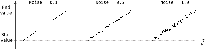 The random noise is configured by the property Noise. This property expects values lying in the range 0.0..1.0. The larger the value the more intense the noise affect. Initializing Noise with 0.0 (zero) disabled the noise function. The following graphs present the course of the default Linear timing function with the random noise configured with different values: