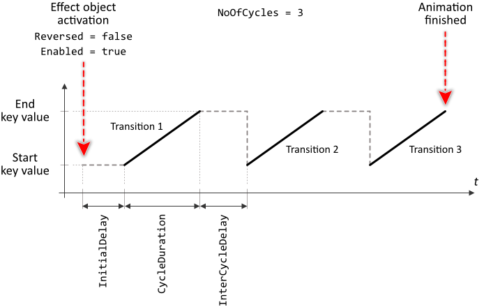 Per default, as long as an Effect object is enabled, its transition is repeated endlessly. In other words, after the transition has reached the end value, the animation starts again with the start value. This can be controlled more exactly by modifying the property NoOfCycles. Initializing this property with the value 4 will cause the animation to repeat the transition four times. Afterwards the animation stops and deactivates itself. Accordingly, if you want to limit the animation to a single run, you have to initialize NoOfCycles with the value 1. Initializing NoOfCycles with 0 (zero) restores the default behavior of the transition being repeated endlessly.