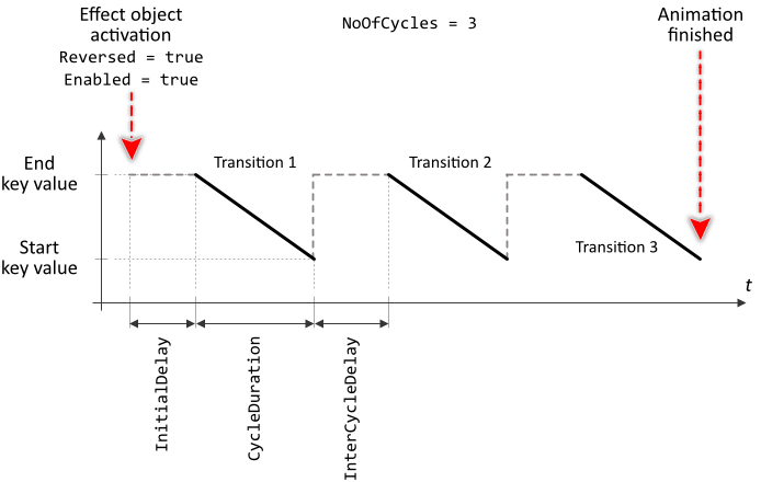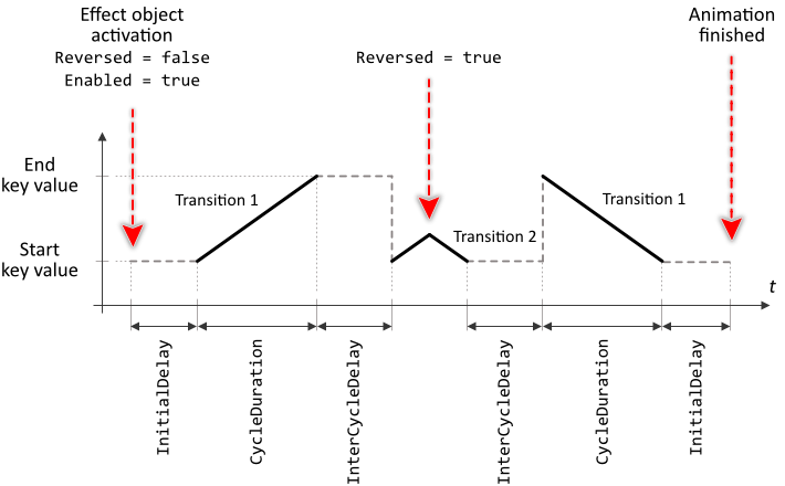 If this property is set true still before the animation is started, the Effect object will behave as if it had been configured with exchanged start and end key values and the timing function mirrored. All other aspects like the eventually specified InitialDelay and InterCycleDelay remain unaffected. In other words, the Effect object plays the transitions reverse beginning with the end key value. The following figure demonstrates the resulting course of such animation: