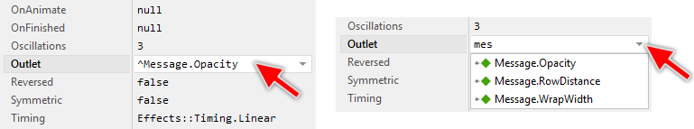 The connection is established by initializing the Effect's property Outlet with a reference to the property you in fact intend to animate. The reference is built by prefixing the name of the desired property with a reference operator ^. For example, if you want the Animation Effect to control the Opacity property of a Text view named Message, you have to initialize Outlet with the expression ^Message.Opacity as shown in the screenshot below. Please note, that using the Inspector Assistant you can conveniently select the right property: