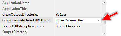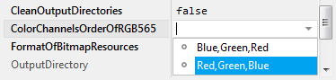 Please note, the attribute can be hidden if the Platform Package selected in the particular profile member doesn't support the direct-access mode for generated bitmap data (see ModeOfBitmapResources) or the layout of how the RGB565 pixel data are stored in the target device is fixed and can't be configured.