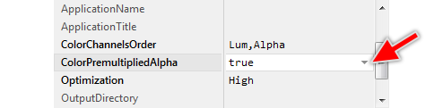 The attribute ColorPremultipliedAlpha determines whether the target system calculates with color channels premultiplied with their corresponding alpha values or not. The setting affects directly the format of how bitmap resources are converted and stored in the generated code. However, it has an effect only when the related attribute ModeOfBitmapResources is configured with the value DirectAccess. Otherwise the setting of ColorPremultipliedAlpha is ignored.