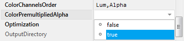 To inspect or modify the value of a ColorPremultipliedAlpha attribute, select first the affected profile member. Thereupon, the attribute is listed in the middle area of Inspector. Please note the available assistant you can activate by clicking on the button