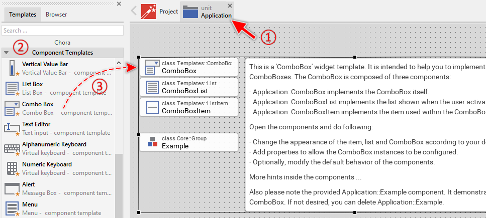 The approach with component templates has two functions. Primarily the templates should simplify the development of new components. Instead of creating the Combo Box from scratch you can use the available template. The second function is more educative. The template implements fully working Combo Box component you can investigate and learn about the corresponding programming aspects. The template is well documented. It contains annotations and inline comments with instructions helping you to understand how the component works and how it can be adapted to your particular needs.