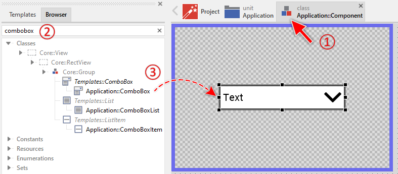 To create a new Combo Box component from a template you simply Drag & Drop it between the Templates window and the Composer with an opened unit. This is important in that by using the component templates you add in fact a new class to your project. Classes, in turn, can exist within units only. The following are the typical steps to create a new Combo Box component from a template: