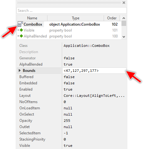 As long as the Combo Box is selected you can inspect and modify its properties conveniently in the Inspector window as demonstrated with the property Bounds in the screenshot below. This is in so far worth mentioning as diverse features of the Combo Box are controlled by the corresponding properties. If you are not familiar with the concept of a property and the usage of Inspector window, please read first the preceding chapter Compositing component appearance.