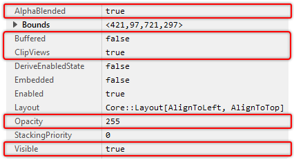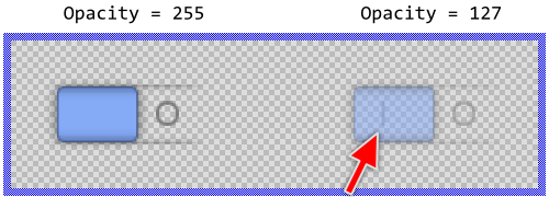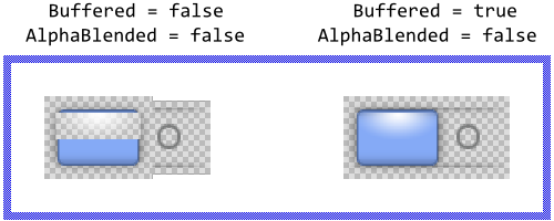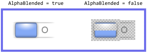 Similarly to the property Opacity, the effect of setting AlphaBlended to the value false is applied individually to every view existing within the component. In other words, if you have two image views arranged one above the other, the lower view will override the contents in the background and then the upper view is displayed overriding the resulting contents inclusive the image behind it. This is the reason why in the right switch from the above screenshot you see a hole where the left switch displays the white highlight effect. Again by using the property Buffered you can improve this behavior: