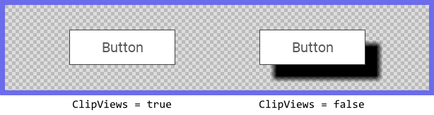 Per default, the content of a component (the views and other components embedded inside it) is clipped at the edges of the component. As result the component does not display any contents found outside its boundary area. This behaviour contributes significantly to better screen update performance. Nevertheless, in some cases it can be useful to suppress this clipping and display all component contents even if these cross the edges of the component. Typical example can be a shadow effect which should extend beyond the borders of the component. For this purpose exist the property ClipViews. In the following example, the shadow effect is displayed by the button component. By deactivating the clipping, the shadow is visible: