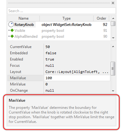 Now, as explained above you use the Inspector window to configure the properties of the just added widget. Please note the description area in the bottom part of the Inspector. When you select a property, this area displays useful information regarding the property:
