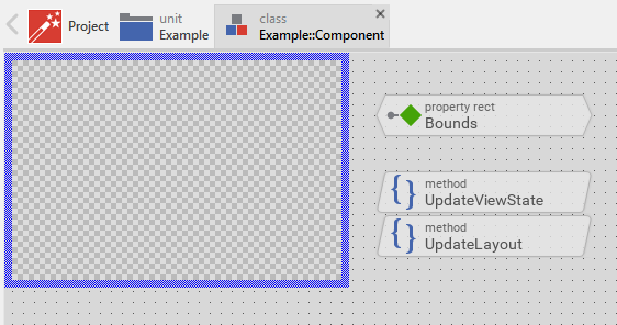 In the top-left corner of the Composer you see the Canvas area. It is surrounded by the thick blue border. You can consider this area as the part of your component, which later is visible on the screen. If the affected component is a new one, the Canvas area appears empty filled only with a checkerboard pattern representing the actual transparent screen background: