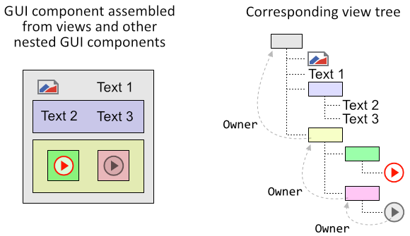 You can imagine, the nesting several components one inside another results in a tree-like structure reflecting the relationships between the affected components. The following image demonstrates this aspect. You see here a GUI component assembled from several nested components and views. In the figure the components are visualized as colored rectangles. On the right you see the corresponding view tree with the Owner relationships: