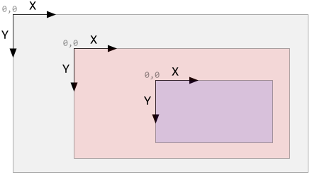 Every GUI component calculates the position of its embedded views within its own coordinate space. The origin of this coordinate space (the position X=0, Y=0) is found at the top-left corner of the respective component with values increasing right-down. In other words, if you arrange or move views within a component, you do this always within its own local coordinate space. This coordinate space is independent of the coordinates managed by the next superior component. You can imagine, every nested GUI component manages its own local coordinate space. The following figure demonstrates it with three nested GUI components: