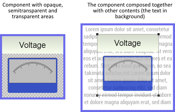 For example, when you add an Image view to the component and configure this view with 50% opacity, the affected area of the component will become semitransparent. The following screenshot demonstrates it. On the left you see a simple component containing opaque, semitransparent and transparent areas. On the right you see how such component is composed together with other contents found in the background: