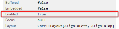 Please note, as long as not enabled, the affected component can't become focused. Similarly, changing the property Enabled to the value false while the affected component was focused, revokes automatically its focused and selected states.