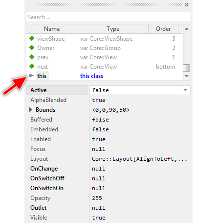 In this manner you can conveniently evaluate or modify the properties. By modifying the properties you determine the default values valid for all instances of the component and other components derived from it. Let's assume, you want all instances to be invisible per default. In such case, change the property Visible of the selected this member to the value false. Later, when you create an instance of the affected component, the component will be invisible unless you explicitly change its property Visible.
