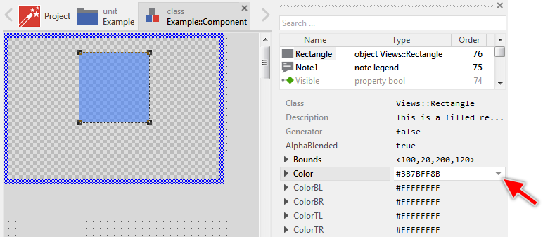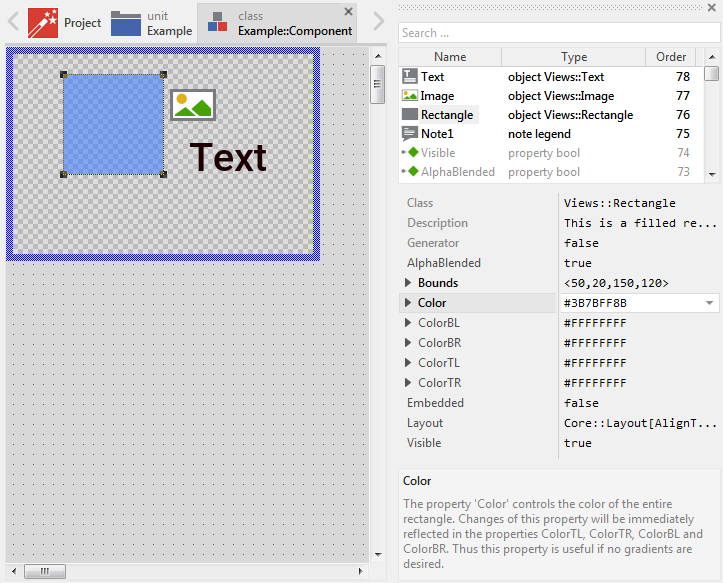 When you select a view you can inspect and modify its properties conveniently in the Inspector window. You can consider the properties as variables where the individual parameters of the respective view are stored. By changing a property the view updates accordingly its appearance. For example, if you have a Filled Rectangle view within your component, you can see and modify in the Inspector window its property Color, which instantly affects the appearance of the rectangle: