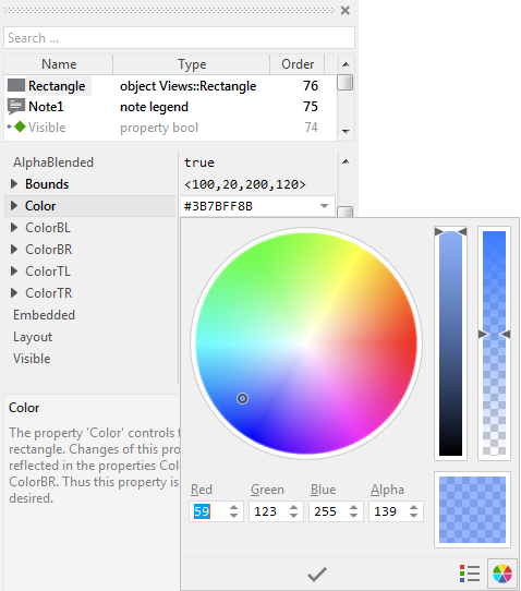 The Inspector is a very powerful tool. It provides for the most of Chora data types specially optimized Assistant windows. With an Assistant you can conveniently browse and select the right value for the affected property instead of manually entering the literal expressions. For example, the Assistant for a color property permits you to pick the desired color from a color wheel. Similarly you can select the luminance and opacity of the color: