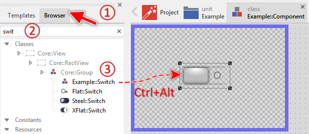 In order to add an instance of an already implemented GUI component, you use the Browser window: