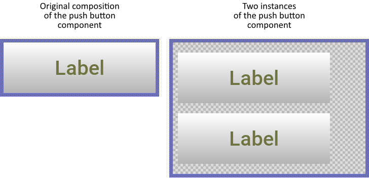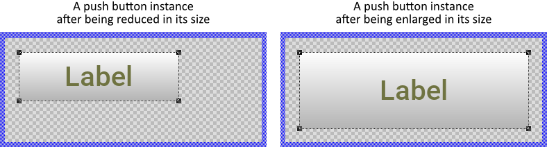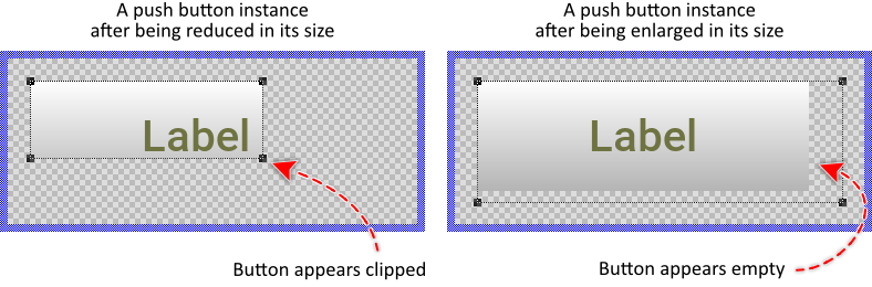 Per default, when the size of the component is reduced, the views existing inside it are simply clipped at the new edges of the component. In turn if the component is enlarged, the new exposed component areas appear empty and transparent. The following figure demonstrates two instances of a push button, one after being reduced and the other after being enlarged: