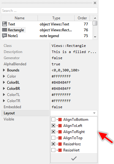 Primarily with the options you control the alignment between the edges of the view and the corresponding edges of the component. For example, activating the option AlignToRight will cause the view to maintain the originally defined distance between its own right edge and the right edge of the component area itself. The view seems to stick right aligned when the component is resized. If this option is not active, the distance is ignored.